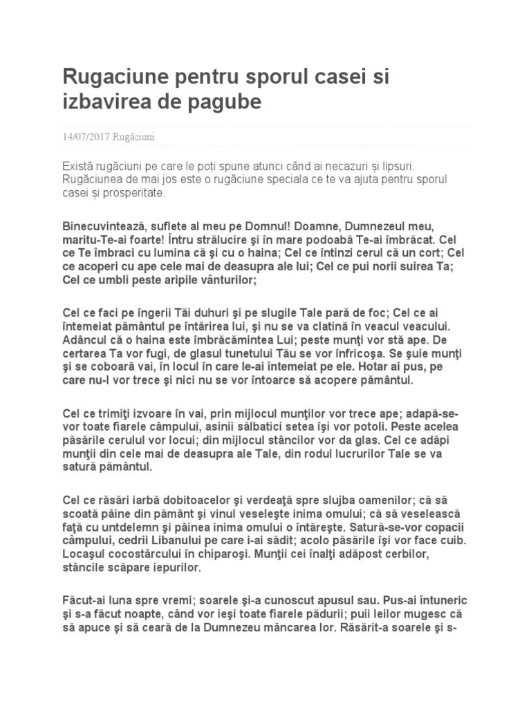 01.07.2013 · rugăciune pentru sporul casei, din psalmii vecerniei: Celor care se află în această situație, le recomandăm să rostească această rugăciune pentru sporul casei. Binecuvintează, suflete al meu pe domnul! Nu puține au fost cazurile când oamenii se plâng că nimic nu se mai leagă, iar banii, oricât de mulți ar fi, dispar ca prin farmec. Întru strălucire şi în … În acel moment, citiți cu toată încrederea o rugăciune specială pentru sporul casei. 20.09.2018 · rugăciune specială pentru sporul casei….. Poate că nu vă este străină expresia: