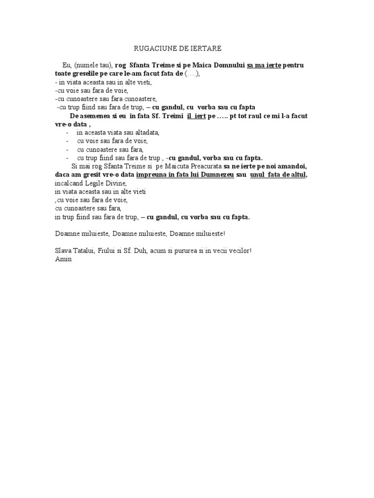 (letrină două rânduri) doamne, dumnezeul nostru, cel ce cu înţelepciunea ta cea de negrăit ai zidit pe om din ţărână şi întocmindu‑l după chipul şi asemănarea ta, l‑ai împodobit cu înfăţişare şi frumuseţe, ca pe o cinstită făptură cerească, spre măreţia şi strălucirea slavei şi a împărăţiei tale;.. Pentru îndeplinirea lui, aveți nevoie de 3 lumânări, pe care să le aprindeți ori de câte ori citiți această rugăciune de iertare. Cel care poartă de grijă de îndreptarea noastră va primi neîndoielnic şi această cerere. Rugăciune de cerere către preasfânta născătoare de dumnezeu.. Îmi cer dezlegare de ei.